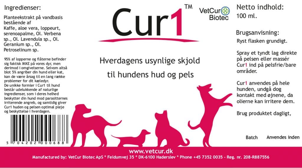 Spray direkte på pelsen eller massér Cur1 ind på pelsfrie/bare områder. Cur1 anvendes på hele hunden, undgå dog kontakt med øjnene, da olierne kan irritere dem. Brug produktet dagligt, som kur eller efter behov.